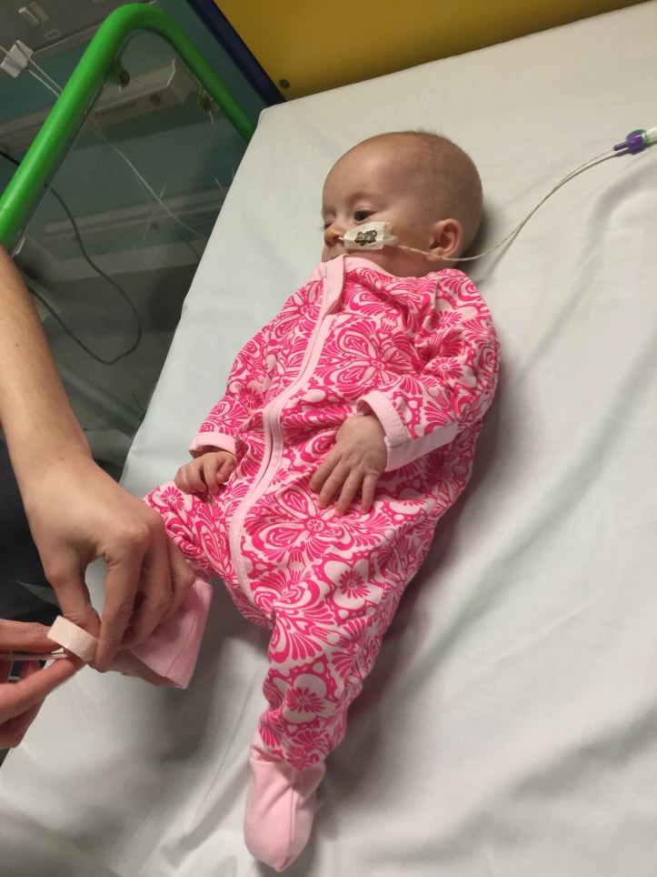 This picture shows how far we came – even getting her surgical name tag fitted! Note the zipped front top – a top tip from other parents duly noted.